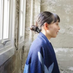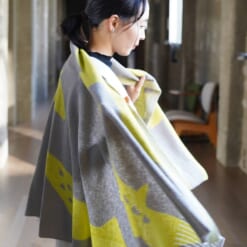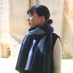 このストールは、綿とウールの素材を使用し、「丸編み」という技法で作られています。