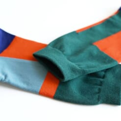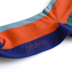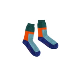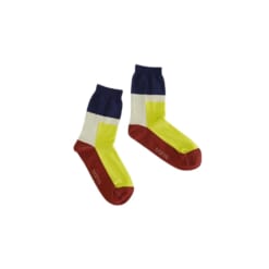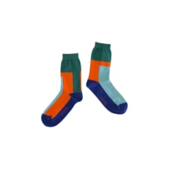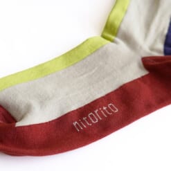 上杉公園のお堀と、そこに並ぶ石造をイメージしてデザインした クルーソックス「block」は、水面に映る光や石の陰影がつくるリズムを、ブロックの形と色の重なりでパキッと表現しました。